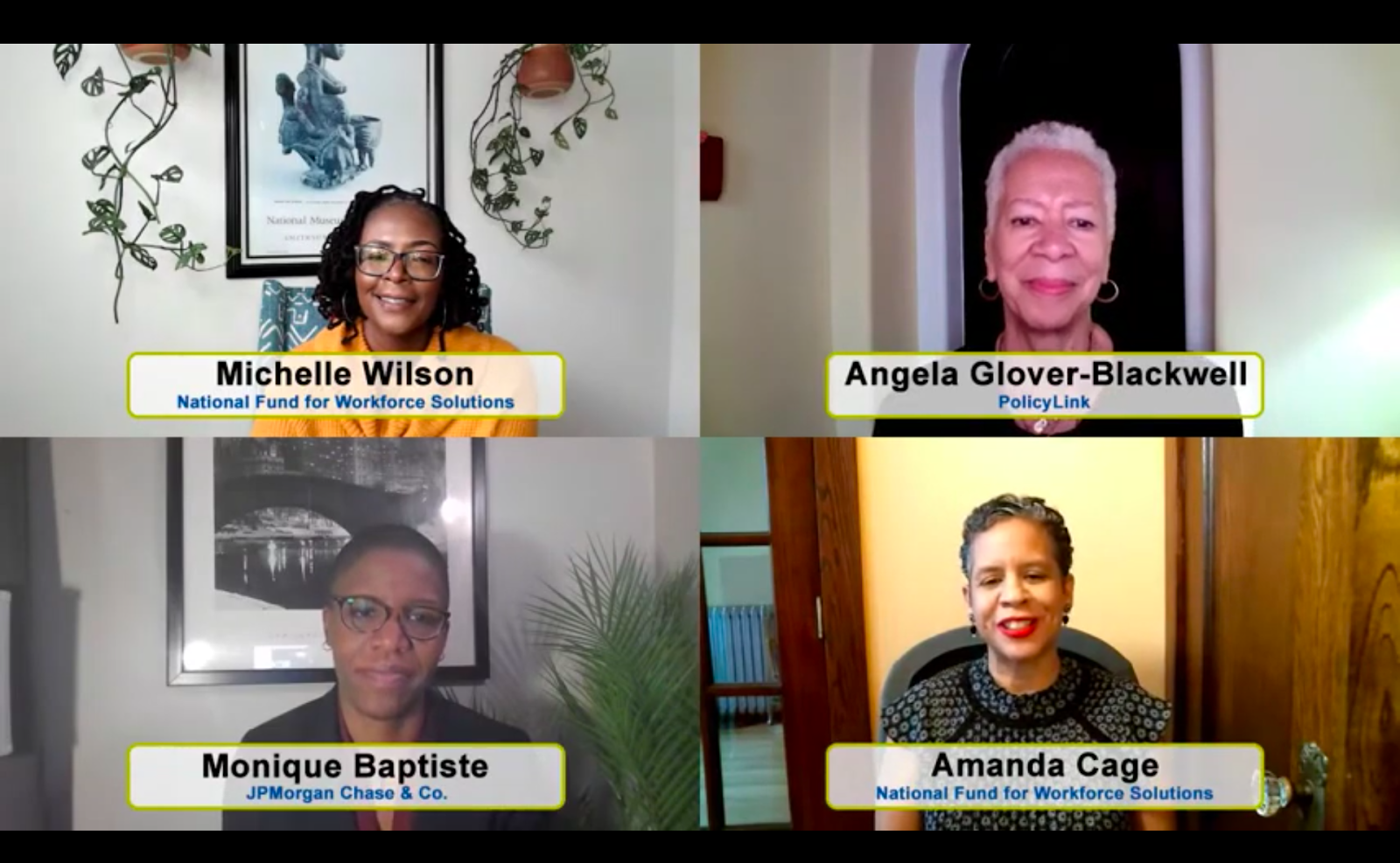 On January 26, the National Fund for Workforce Solutions hosted a virtual launch event which featured local leaders from each community as well as Angela Glover Blackwell (PolicyLink), Amanda Cage (National Fund for Workforce Solutions), and Monique Baptiste (JPMorgan Chase & Co).